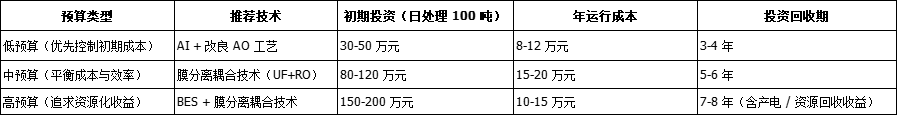 注:投資回收期已包含資源化收益(如電費(fèi)節(jié)省、鹽分銷售),實(shí)際需根據(jù)當(dāng)?shù)仉妰r(jià)、資源回收價(jià)格調(diào)整。